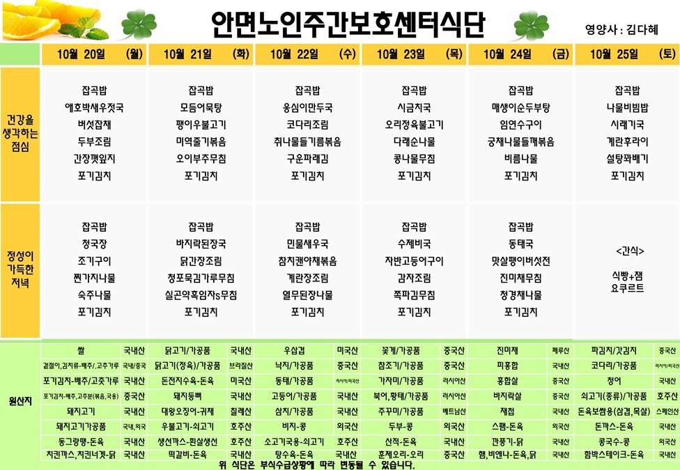 25년 10월 4주차 식단표